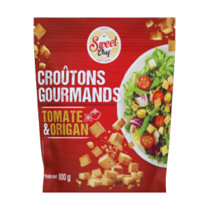 Ajoutez du goût et du croustillant à vos plats avec les Croûtons Gourmands Fromage SweetChef. Leur texture croquante et leur saveur fromagère intense subliment salades, soupes et plats chauds. Prêts à l’emploi, pratiques et gourmands, ils apportent une touche savoureuse à toutes vos recettes du quotidien. Format 100 g.